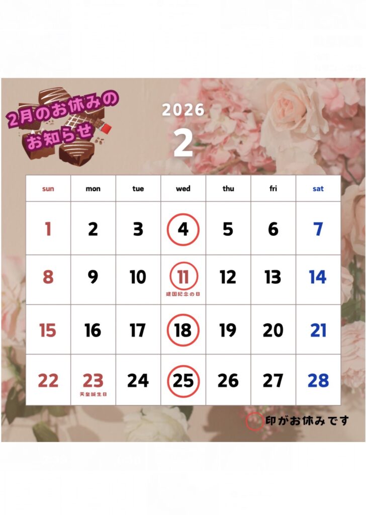 2月のお休みのお知らせ- ̗̀ 📢💭2026.1.30皆さんこんにちは┏○ペコッ相変わらず寒い日が続きますね🥶💨まぁ本来なら冬☃❄な…