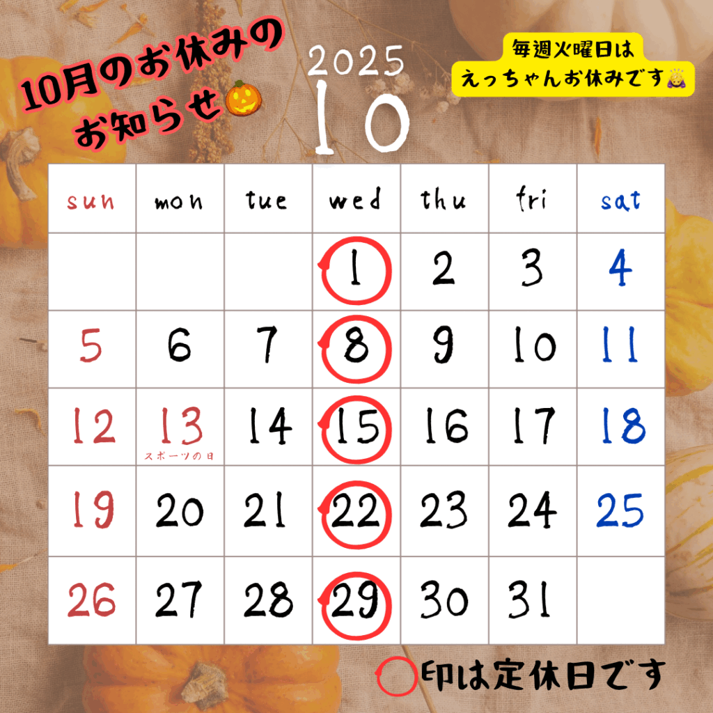 10月のお休みのお知らせ📢